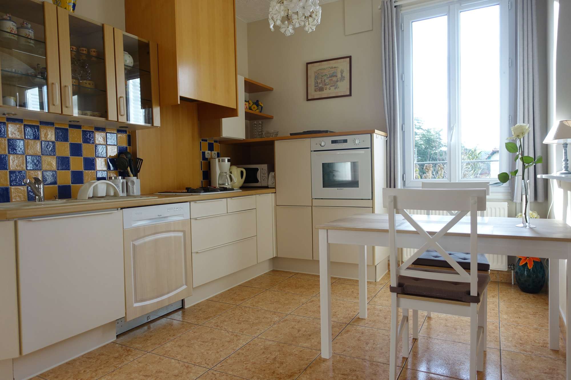 Cuisine américaine dans la pièce de séjour avec éléments de rangement hauts et bas, hotte, plaque 4 feux électriques, four, micro-onde, lave-vaisselle, évier un bac avec mitigeur, un réfrigérateur 180 litres avec compartiment congélation, une batterie de cuisine complète avec autocuiseur, couverts, vaisselle et verrerie complètes couvrant 3 fois la capacité d’accueil du meublé, cafetière électrique, grille-pain et bouilloire électrique.